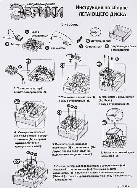 Установите мотор в базу с отверстиями. Соедините детали между собой так, как показано в инструкции. Нажмите на кнопку включателя, и диск полетит!