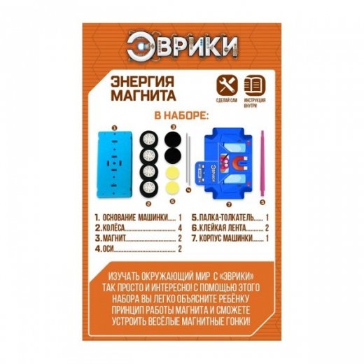 С помощью набора «Энергия магнита» вы легко объясните ребёнку принцип работы магнита и даже устроите весёлые гонки. Иногда магниты не только притягиваются, но и наоборот, отталкиваются. Именно на этом принципе и работает машинка. Попробуйте сами и на практике изучите свойства магнита.