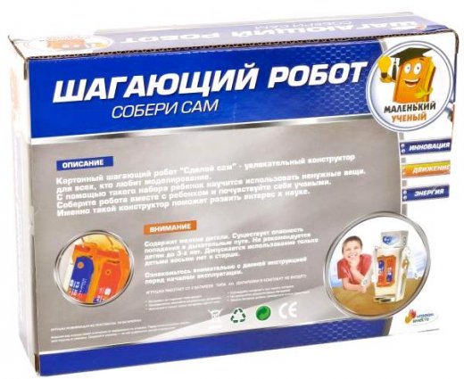 Робот способен шагать. Его приводит в движение маленький моторчик. Юный инженер будет снова и снова наблюдать за действиями игрушки собственного производства. Собирая робота, школьник поймет, что можно с пользой использовать, казалось бы, на первый взгляд, совершенно ненужные вещи. Юный техник сможет познакомится с основными понятиями физики и электроники, а также потренирует свои конструкторские способности. Ребенок узнает о том, как устроены простые электронные цепи и опытным путем увидит их действие на деле.