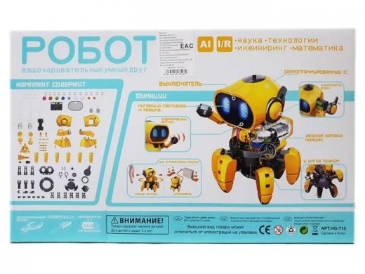 Умный робот на 6 ногах, собранный своими руками – что может быть лучше. Для начала игры, следует по схеме, соединить различные детали воедино. Для работы пригодятся инструменты – кусачки и крестовая отвертка. В движение робота приводят 4 батарейки типа ААА, которые приобретаются отдельно. У робота 2 интерактивных режима – преследование и изучение. В первом варианте он, как домашний питомец, спешит за объектом, который к нему приближается. А во втором – обходит препятствия и выстраивает альтернативные маршруты. Это возможно благодаря встроенному инфракрасному датчику. Как маленький паучок, робот ловко передвигается на 6 ножках. Он издает мелодичные звуки, мигает лампочками и даже жестикулирует. Отличный подарок для любознательных детей.