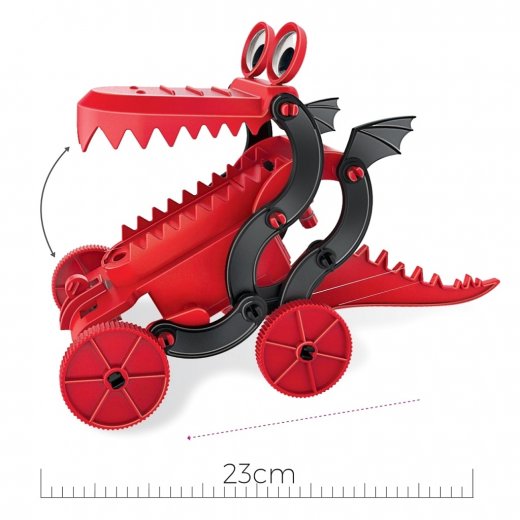 Соберите робота-дракона, который ползает по полу и открывает свои огненные челюсти. Полезный набор, который поможет не только увлечь игрой, но и изучить механизм работы игрушки. Этапы работы показаны на диаграммах в инструкции. Создание машины начинается со сборки механического сердца. Затем части корпуса закрепляются на осях. Когда конструкция будет готова, установите элемент питания и включите игрушку. От мотора движение через систему шестеренок переходит к соединителям. Они толкают задние колеса вперед и назад и заставляют челюсти щелкать.