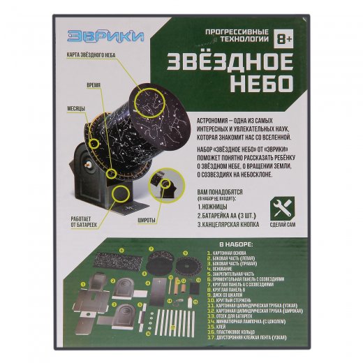 Конструктор Эврики "Звездное небо" подойдет для самых маленьких любителей астрономии, желающих познать все тайны необъятной Вселенной. Это очень интересный проектор, который ребенок должен собрать своими руками. После того, как сборка окончена, проектор сможет отображать изображение ночного неба и небесных тел.