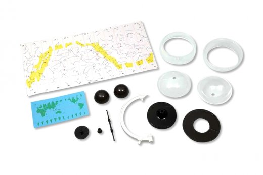 Состав набора: наклейка звездного неба, наклейка Земли, прозрачная капсула, капсула Земли, фиксирующая шайба, осевой колпачок, ось, меридианная дуга, подставка, диск горизонта.