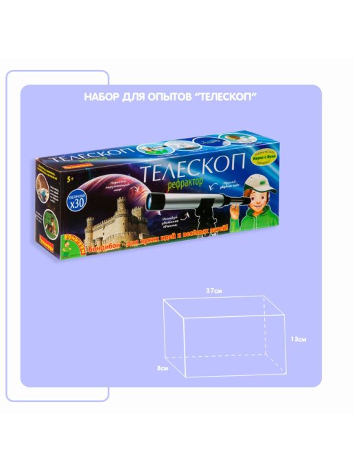 Установите телескоп на штатив и приступайте к изучению окружающего мира! Телескоп дает х30 увеличение и позволяет исследовать удаленные объекты, изучать звёздное небо, наблюдать за природными явлениями, смотреть на животных, не нарушая их покой. Игры с набором от Bondibon помогут Вашему ребенку получить новые или закрепить уже имеющиеся школьные знания, а также блеснуть перед одноклассниками занимательными историями о проведенных им опытах!