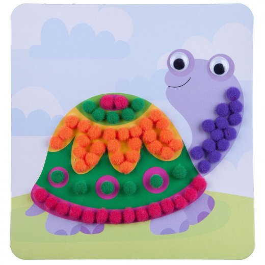 С помощью этого набора вы сможете окунуться в творческий и увлекательный процесс, создать свою волшебную аппликацию! Ребенку предлагается украсить изображенную черепашку маленькими помпончиками. Чтобы изготовить красивую аппликацию, необходимо заранее продумать места, куда хочется положить помпончики. После чего аккуратно приклеить их с помощью клея. Готовую картинку можно поместить в рамку и украсить ею интерьер, а также подарить ее в качестве сувенира, сделанного своими руками.