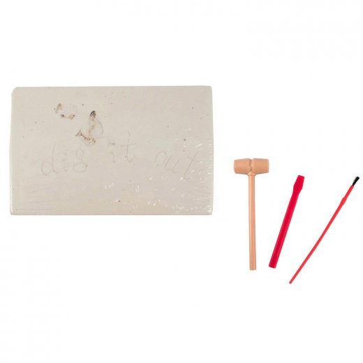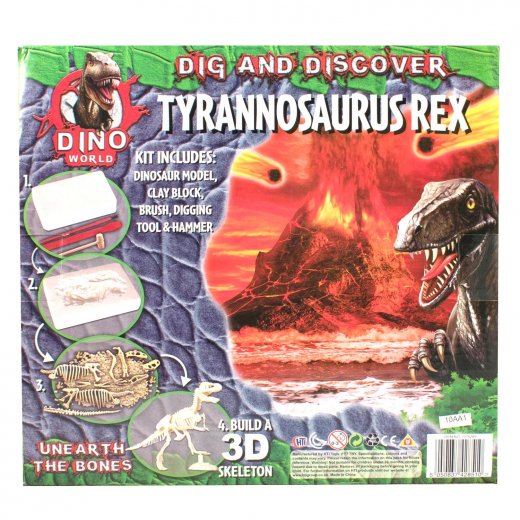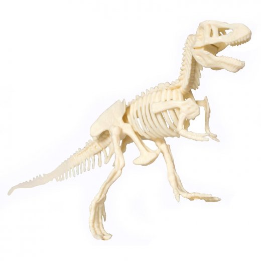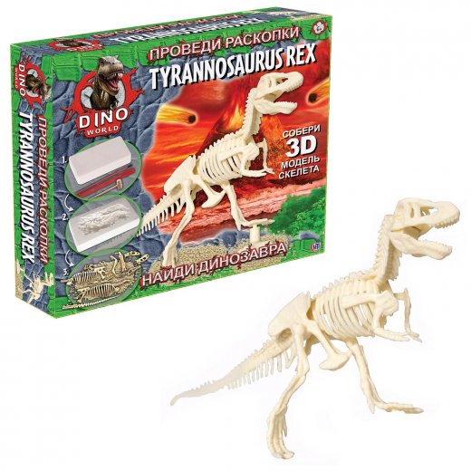 С данным набором ваш ребенок почувствует себя настоящим палеонтологом и познакомится с одним из обитателей мелового периода нашей планеты – динозавром Т-Рекс. Ребенку предстоит произвести раскопки при помощи специальных инструментов, которые входят в набор. Орудуя стамеской, молоточком и кисточкой, необходимо извлечь части скелета Т-Рекса из гипсового блока. Далее, после того как все части будут извлечены, необходимо собрать скелет динозавра. Размер собранного скелета ~ 15 см. Примечательно еще то, что в собранном скелете ноги и голова динозавра - подвижные.