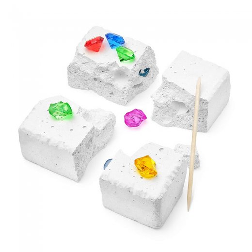 Состав набора: окаменелый грунт, деревянный стек для дробления, сокровища.