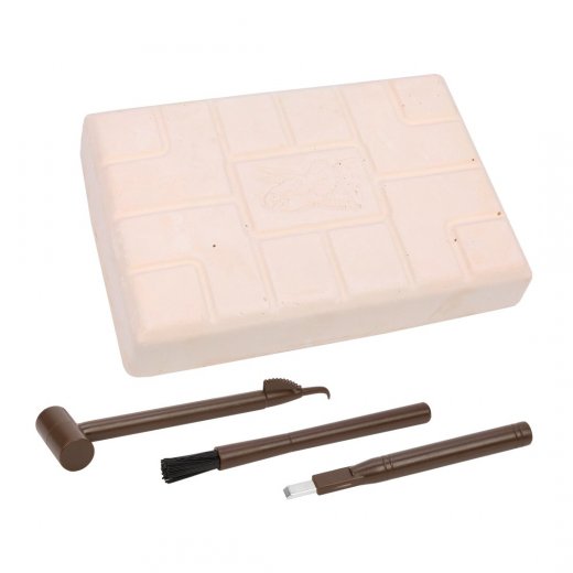 Состав набора: гипсовый брусок со скелетом динозавра, 3 инструмента для раскопок.