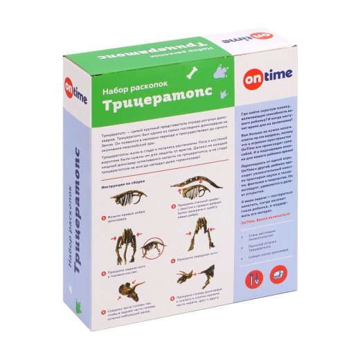 Настало время изучать динозавров! Ведь дети просто обожают этих древних загадочных животных и всё, что с ними связано. И в этом как нельзя юным археологам лучше поможет увлекательный набор для раскопок «Трицератопс» от торговой марки ON TIME. Он включает гипсовый брусок со скелетом динозавра и 3 инструмента для раскопок.