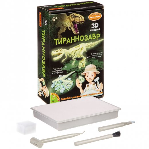 Состав набора: блок для проведения раскопок, молоток, зубило, губка, кисточка, скелет динозавра, инструкция.