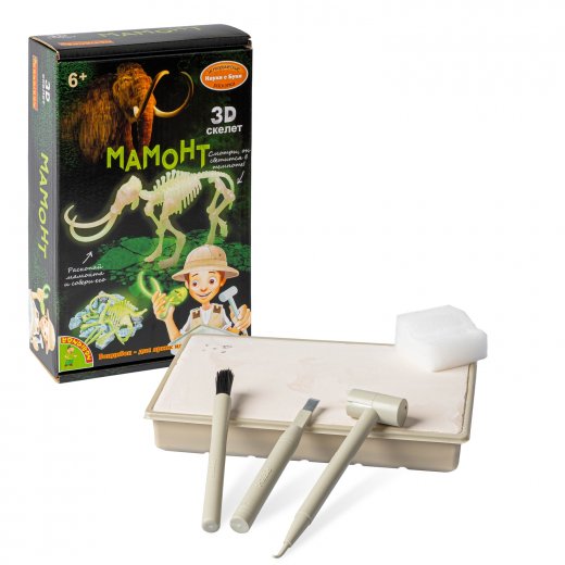 С помощью этого обучающего набора юный учёный сможет самостоятельно провести раскопки, используя настоящие инструменты палеонтолога. Проделывать эту работу нужно без спешки, что бы не повредить ископаемые! Немного терпения, и все кости будут найдены, потом останется собрать их по инструкции в скелет, который будет светиться в темноте.