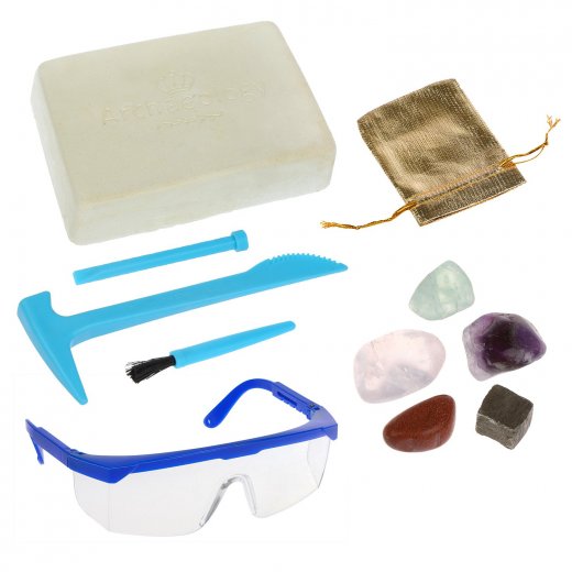 С помощью специальных инструментов ребёнок раскопает камни, а используя кисточку, удалит с них остатки гипса. Подробную информацию о камнях с их описанием, свойствами и историей можно найти в иллюстрированной инструкции. Камни представляют собой подлинные кристаллы и минералы, среди которых есть аметист, авантюрин, зелёный флюорит, пирит, или серный колчедан, и розовый кварц.