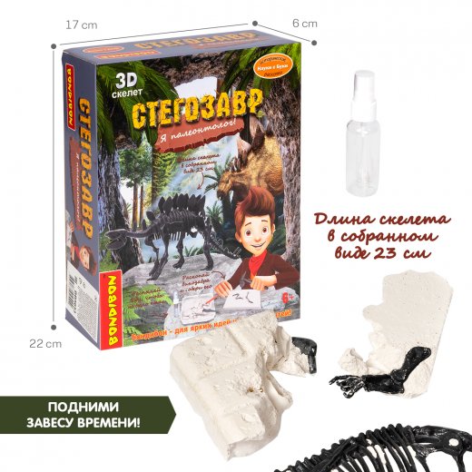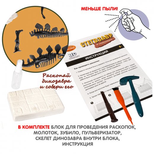 В комплекте: блок для проведения раскопок, молоток, зубило, пузырек с пульверизатором, скелет стегозавра внутри гипсового блока, иллюстрированная инструкция.