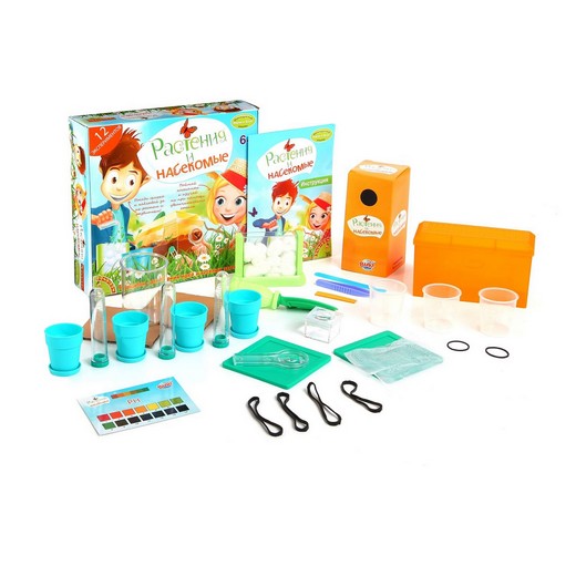 «Растения и насекомые» — набор для оригинальных опытов, который позволит детям углубленно познать удивительный мир живой природы, а также провести массу интересных экспериментов. Вспомните, насколько сильно в детстве все мы любили ловить бабочек. Детям также предлагается поймать насекомое, поместить его в специальный контейнер и изучать при помощи увеличительного стекла. Наблюдения рекомендуется записывать в блокнот (если ребенок не умеет писать — это могут делать взрослые). После изучения, насекомое обязательно нужно отпустить на волю – ни в коем случае нельзя мучить его – это воспитывает в детях жестокость. Ребятам также предложено своими руками вырастить из семян любое растение (например, быстрорастущий редис). Дети смогут посадить семена в специальный горшок и наблюдать за растением. Интересный способ познания живой природы в игровой форме.