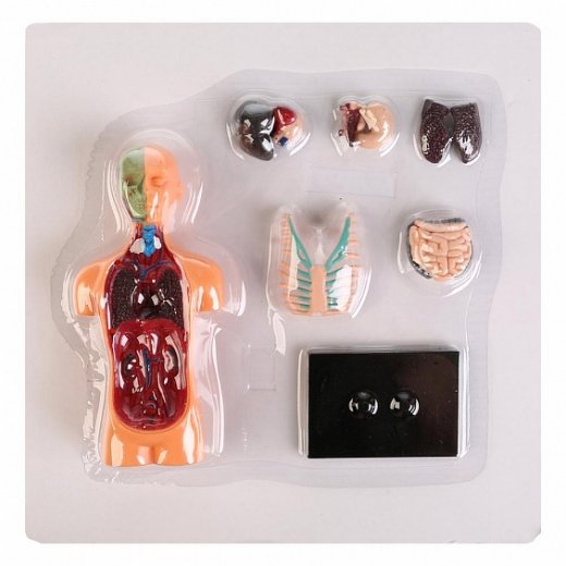 Состав набора: макет человеческого тела, подставка, модельки легких, сердца, печени, поджелудочной железы, желудка, толстой и тонкой кишок, грудной клетки.