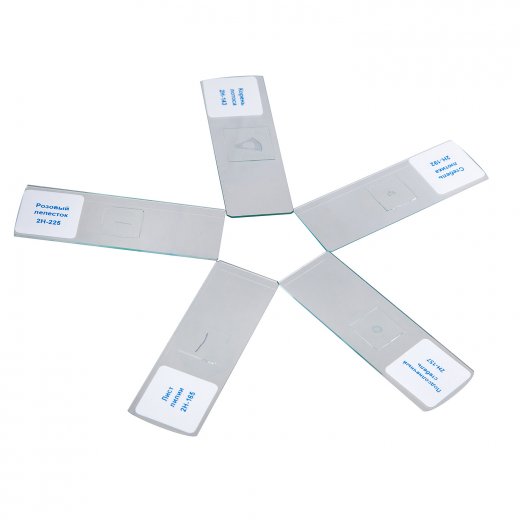 Состав набора: 5 слайдов: подсолнечный стебель, стебель лютика, корень лотоса, розовый лепесток, лист лилия.