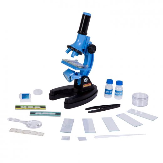 Состав набора: микроскоп, пустые стекла для приготовления образцов (5 штук), чаша Петри, лупа, пинцет, палочка для размешивания, баночки для образцов (2 штуки), готовый слайды (3 штуки), покровное стекло (5 штук), наклейки, инструкция.