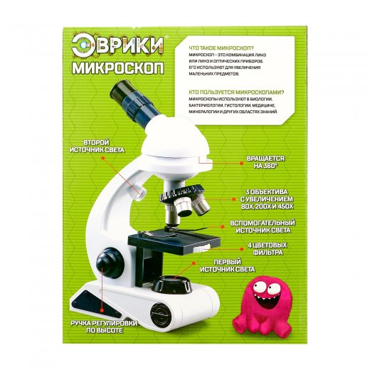 Чтобы узнать, как устроен окружающий мир, нужно посмотреть на привычные вещи под нужным увеличением. С помощью микроскопа Эврики можно исследовать растения, изучать анатомию животных, наблюдать за не видимыми невооруженным взглядом организмами, рассматривать мельчайшие царапины и вмятины на монетах и многое другое. Тем, кто только начинает знакомство с микромиром, пригодится набор для опытов, который входит в комплект.
