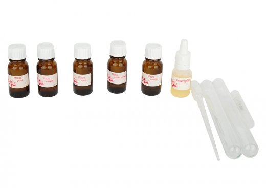 Состав набора: парфюмерное масло мяты (1 флакон), парфюмерное масло лимона (1 флакон); парфюмерное масло иланг-иланг (1 флакон); парфюмерное масло розы (1 флакон); парфюмерное масло пачули (1 флакон); флакон-спрей (1 шт.); основа для духов (1 флакон); пипетки (5 шт.); стеклянные пробирки (2 шт.); блоттеры; подробная инструкция к набору.