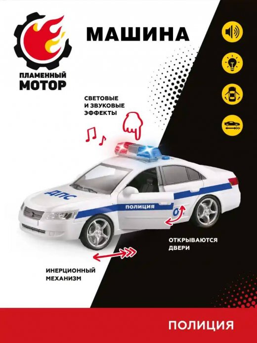 Игрушечная машина с узнаваемым дизайном "Полиция" ТМ "Пламенный мотор" прекрасно подойдет в качестве подарка любителям такого рода игрушек. Со спецтранспортом можно придумать множество сюжетно-ролевых игр, и каждая из них станет яркой и запоминающейся. В машинке предусмотрен инерционный механизм движения: чтобы машина двигалась вперед самостоятельно, разместите ее на относительно ровной поверхности, затем поступательными движениями руки разгоните ее на месте и отпустите. Машина помчится вперед! Двери салона можно открывать и закрывать. Если нажать на кнопки, размещенные на крыше автомобиля, то можно услышать характерные реалистичные звуки (звук заводящегося мотора, предупредительный звуковой сигнал, звуковой сигнал при реверсивном движении, полицейскую сирену), при этом проблесковые маячки будут подсвечиваться. Звуковые и световые эффекты работают от 3-х батареек типа AG13 (элементы питания прилагаются). Размер изделия (ДхШхВ): 24х9х9,5 см. Изготовлено полимерных материалов с элементами из металла.