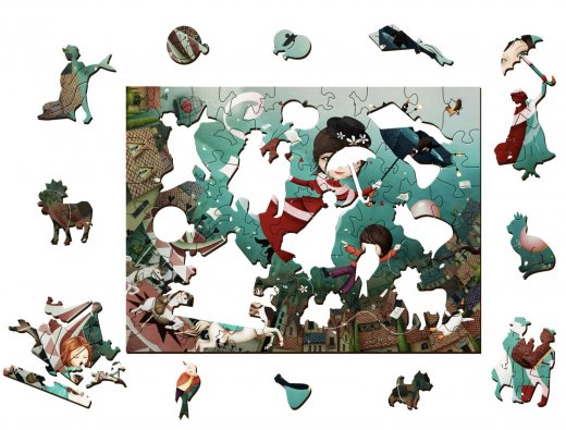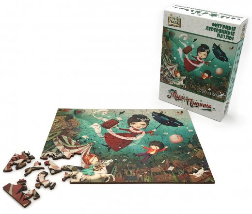 Фигурный пазл отличается от стандартного необычной формой деталей. Кроме того, часть деталей выполнены в форме предметов, связанных с тематикой картинки. В данном случае это, персонажи и предметы связанные со сказкой про Мэри Попинс.