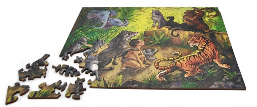 Деревянный фигурный пазл отличается от стандартного необычной формой деталей. Здесь можно найти как детали причудливой формы, так и фигуры элементов по мотивам изображения. В данном случае это, персонажи и предметы связанные со сказкой Маугли (Маугли, Балу, Багира, Ширхан, волк, обезьяна, огонь, нож ...).