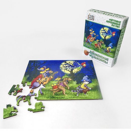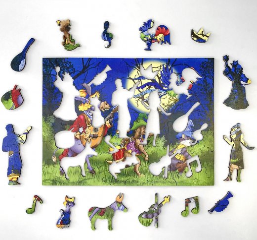 Деревянный фигурный пазл отличается от стандартного необычной формой деталей. Здесь можно найти как детали причудливой формы, так и фигуры элементов по мотивам изображения. В данном случае это, персонажи и предметы, связанные со сказкой Бременские музыканты.