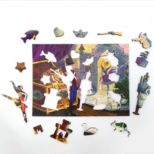 Деревянный фигурный пазл отличается от стандартного необычной формой деталей. Здесь можно найти как детали причудливой формы, так и фигуры элементов по мотивам изображения. В данном случае это, персонажи и предметы, связанные со сказкой про оловянного солдатика.