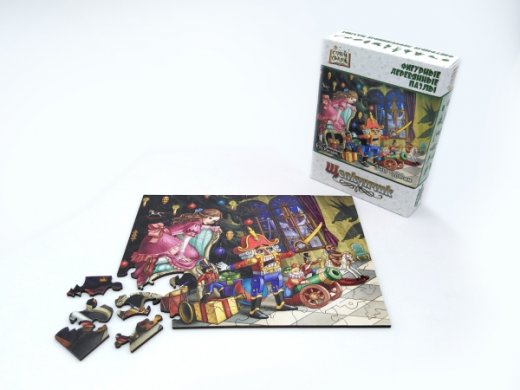 Фигурные пазлы серии страна сказок - это пазлы с изображением сюжета известных сказок с деталями необычной формы. Все детали имеют разную форму. При этом часть элементов выполнены в форме предметов, относящихся к теме основной картинки. Детали выполнены из фанеры.