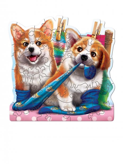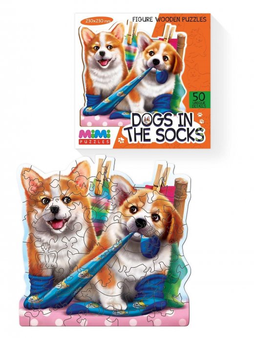 Деревянные пазлы Собачки в носках – это причудливая головоломка из серии Mimi Puzzles. Она подходит для первого знакомства с фигурной мозаикой, так как детали крупного размера.