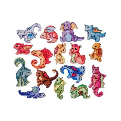 1. Игра «Дракоши». Рассмотрите пазл вместе с ребенком. Обсудите, кто такие драконы, где они живут, что делают. Обратите внимание на строение тела и окраску дракончиков (туловище, крылья, шипы на спине), позу, настроение и т.п. Вместе с ребенком придумайте имена для каждого дракончика.