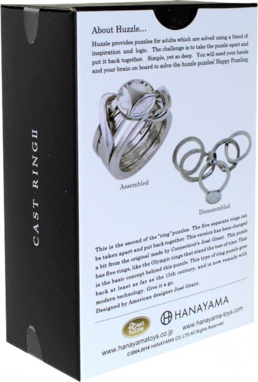 Увлекательная японская головоломка "Кольцо-2" — это вторая из "кольцевых" головоломок. Пять отдельных колец очень легко разъединяются, а вот собрать их обратно в красивое кольцо, достаточно сложно. Этот вариант был немного изменен по сравнению с оригиналом, созданным Жозе Грантом из Коннектикута. В этой головоломке пять колец подобных Олимпийским кольцам, которые выдержали испытание временем. Вот одна из основных концепций этой головоломки. Этот тип кольцевых головоломок восходит к 15 столетию и теперь воссоздан с учетом сегодняшнего опыта в области головоломок.