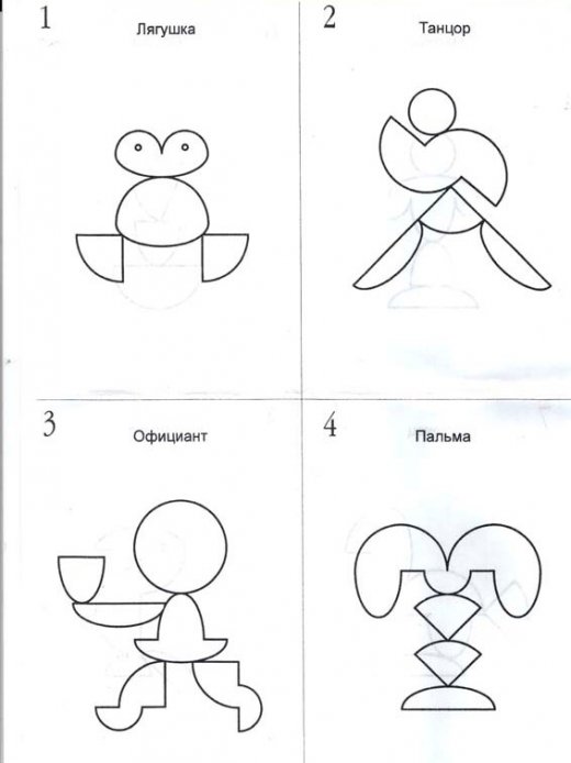 Материал игры (фанера) позволяет обводить карандашом, как отдельные геометрические фигуры, так и получаемые из них силуэты. Это можно использовать для тренировки изобразительных умений ребенка. Игра развивает восприятие формы, способность выделять фигуру из фона, глазомер, воображение и зрительно-моторную координацию.