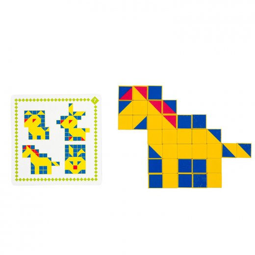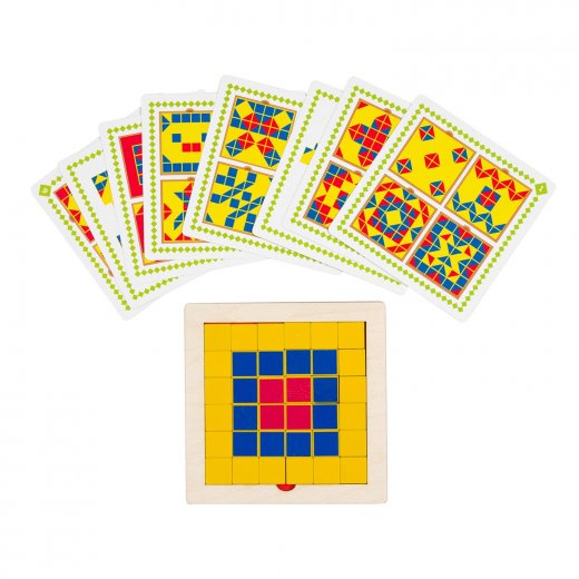В набор также входят восемь карточек с заданиями, рисунок на которых ребёнку нужно будет повторить из деревяшек.