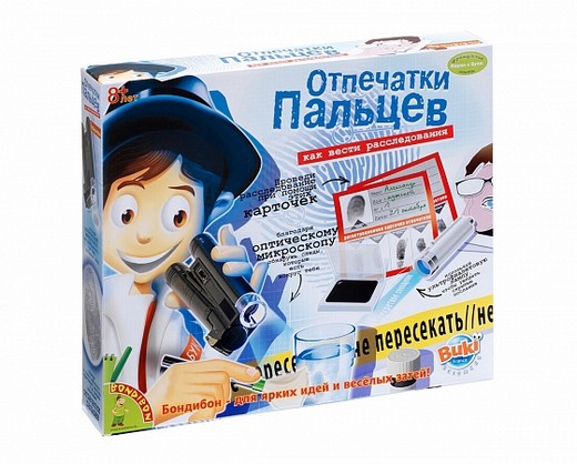 В игру «Отпечатки пальцев» входят оптический микроскоп, химические реагенты для снятия отпечатков пальцев и много других приспособлений, которые помогут ребенку развить наблюдательность, память и освоить азы сыска. Малыш, как настоящий сыщик будет проводить серьезнейшую идентификацию зубов и следов преступника, а затем сможет определить по ним рост, вес и даже профессию подозреваемого! После таких экспериментов вам еще долго не захочется смотреть криминальные сериалы.