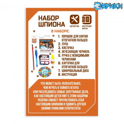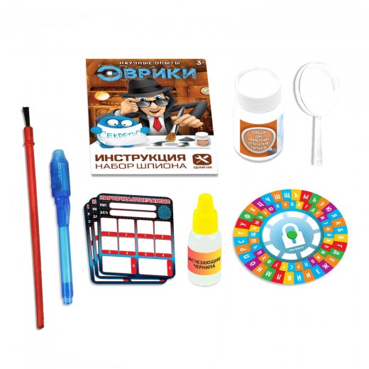 Что может быть увлекательнее, чем играть в тайного агента или расследовать самые запутанные дела, как настоящий детектив? С этим набором ребенок сможет почувствовать себя настоящим шпионом и удивить друзей своими уловками суперагента! С набором шпиона торговой марки «Эврики» ребёнок научится снимать отпечатки пальцев, разработает тайный алфавит и изобретёт невидимые чернила.