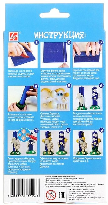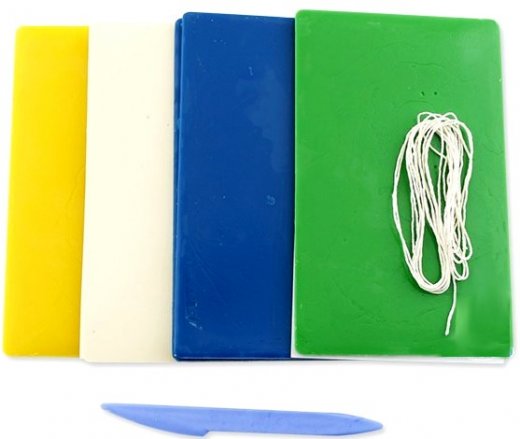 Состав набора: 5 восковых пластин, фитиль, стек, инструкция на обратной стороне упаковки.