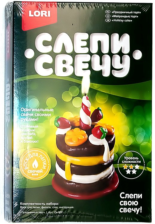 Слепи свечу Праздничный торт – это весьма красочный и увлекательный набор для детского творчества, который поможет Вашему ребенку создать своими руками оригинальный сувенир. В наборе Вы найдете все необходимые материалы: мягкий воск для лепки, фитиль, стек и подробную инструкцию. Сделать такую поделку ребенку самому не составит труда, в крайнем случае можете заглянуть в инструкцию и подсказать.