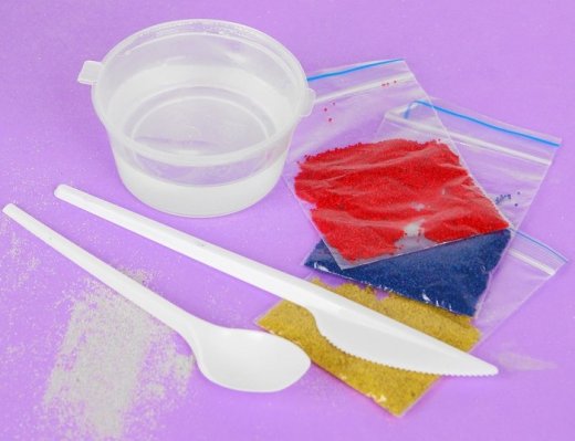 Состав набора: 1 бокал, 3 пакетика с песком разных цветов, 1 баночка с гелем, пластиковые нож и ложка, 1 фитиль, 1 искусственный цветок.