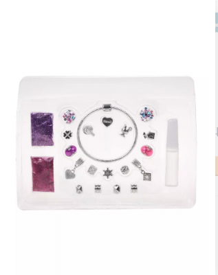 В комплекте — 1 серебристый браслет-основание, 12 очаровательных шармов, стразы, глиттер, клей ПВА и инструкция.