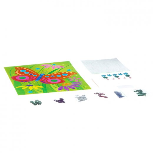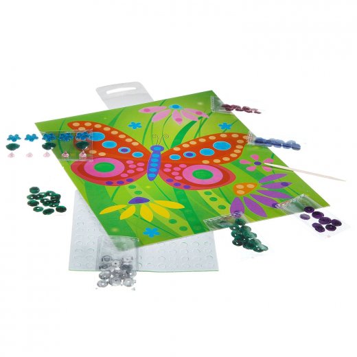 Набор для творчества Бабочка – первые шаги ребёнка старше 5 лет в освоении интересной и красочной техники мозаики. Это самый простой пример мозаики – не сплошное составление картины из мелких элементов, а декорирование её отдельных частей. Украсьте картину разноцветными искрящимися пайетками и стразами! Без клея – аккуратно и чисто!