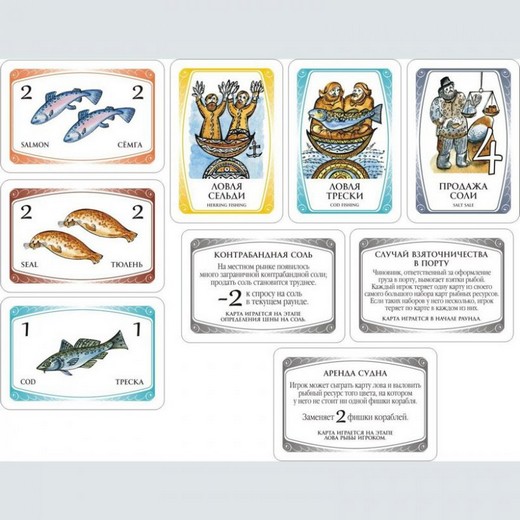 · 2 комплекта из 10 карт для каждого игрока (5 различных карт лова рыбы и - 5 карт продажи соли со значениями "4","6","8","10","12")