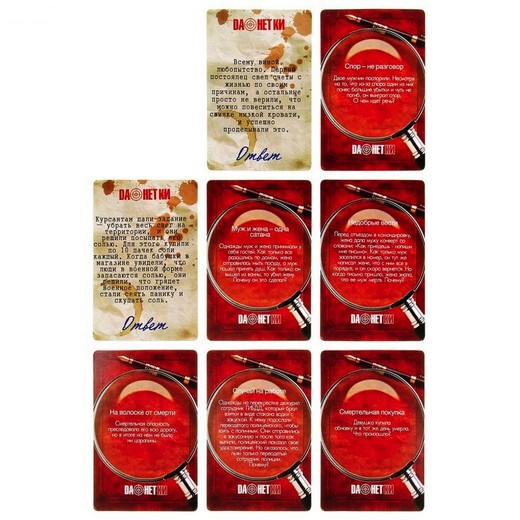 Играть в «данетки» очень просто – ведущий зачитывает часть запутанной истории, а отгадывающие должны восстановить всю ситуацию с помощью вопросов, на которые можно отвечать только «да» или «нет». Внутри коробки вы найдете 35 карточек с историями-«данетками», а отгадка заставит вас удивиться!