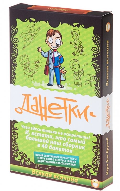 Настольная игра Данетки Всякая всячина новая - это целая колода удивительных историй и, по совместительству, множество увлекательных загадок. Правила этой настольной игры очень просты: один читает краткое условие, а остальные пытаются выяснить все обстоятельства дела, задавая наводящие вопросы. На разгадывание одной данетки уходит от 15 минут до целого часа. При этом удовольствие получают все участники процесса.