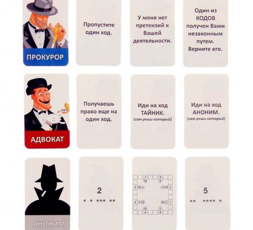 При попадании на ход Адвокат и Прокурор, игрок тянет одну из соответствующих карт и исполняет написанное там требование.