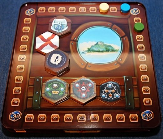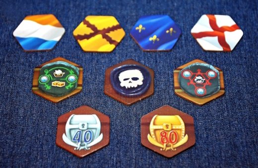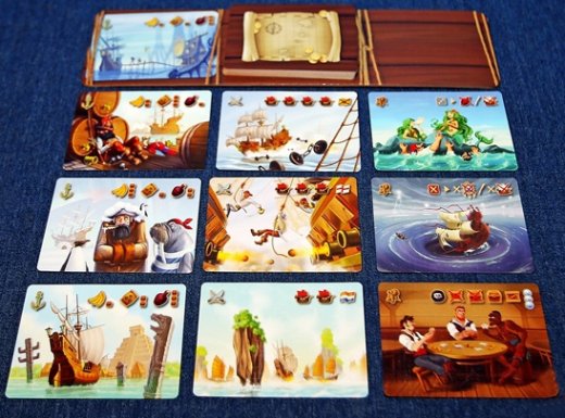 Состав: Игровое поле, счетчик очков, планшет линейки, планшет приключений, карточки персонажей - 28 шт., карточки приключений - 31 шт., карточки трофеев - 60 шт., тайлы черной метки - 6 шт., тайлы корсара - 4 шт., тайлы сундуков с сокровищами 160 шт., жетоны инь-янь - 30 шт., маркеры очков - 4 шт., маркер первого игрока, кубики - 44 шт., правила игры.