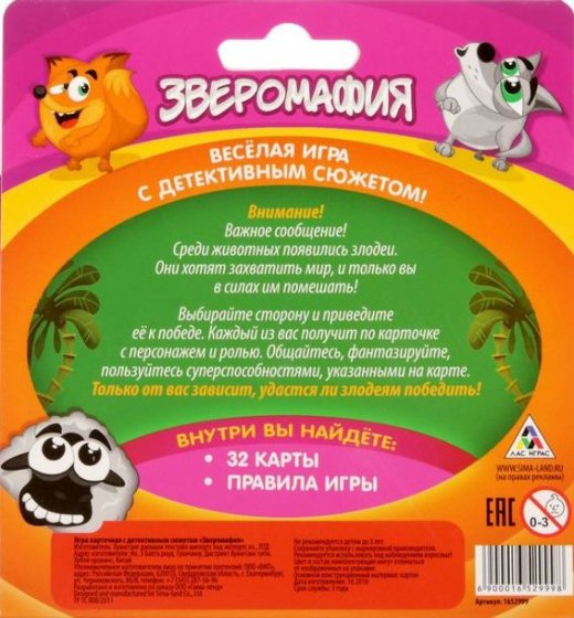 Состав: 16 карт с ролями, 16 карт с животными, правила игры.