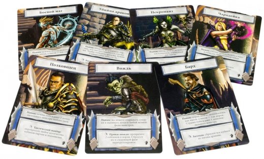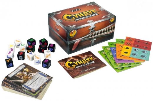 Состав: 15 кубиков, 60 жетонов опыта и сокровищ, 8 карт героев, 4 памятки, правила игры.