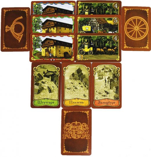Состав: игровое поле, 80 пластиковых домиков, 4 карты главных зданий компании, 20 карт карет, 66 карт городов, 30 бонусных жетонов, 4 памятки, правила игры.