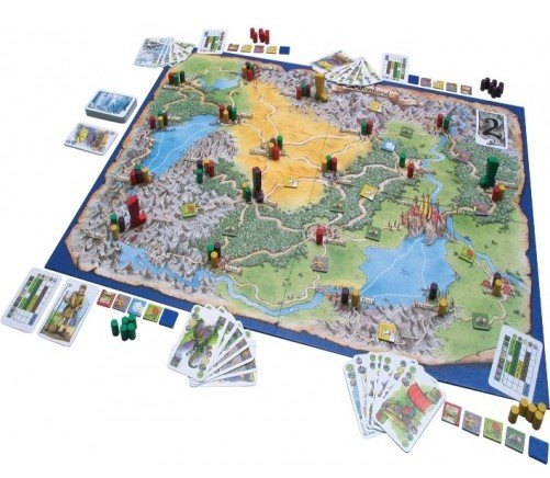 Состав: игровое поле, 6 эльфийских сапожков, 120 городских маркеров (по 20 каждого из 6 цветов), 48 транспортных жетонов (по 8 каждого из 6 типов), 6 жетонов «Препятствие», 72 карты передвижения, 12 карт городов (для особого варианта игры), 6 справочных карт, 1 карта первого игрока, 4 карты текущего раунда, правила игры.